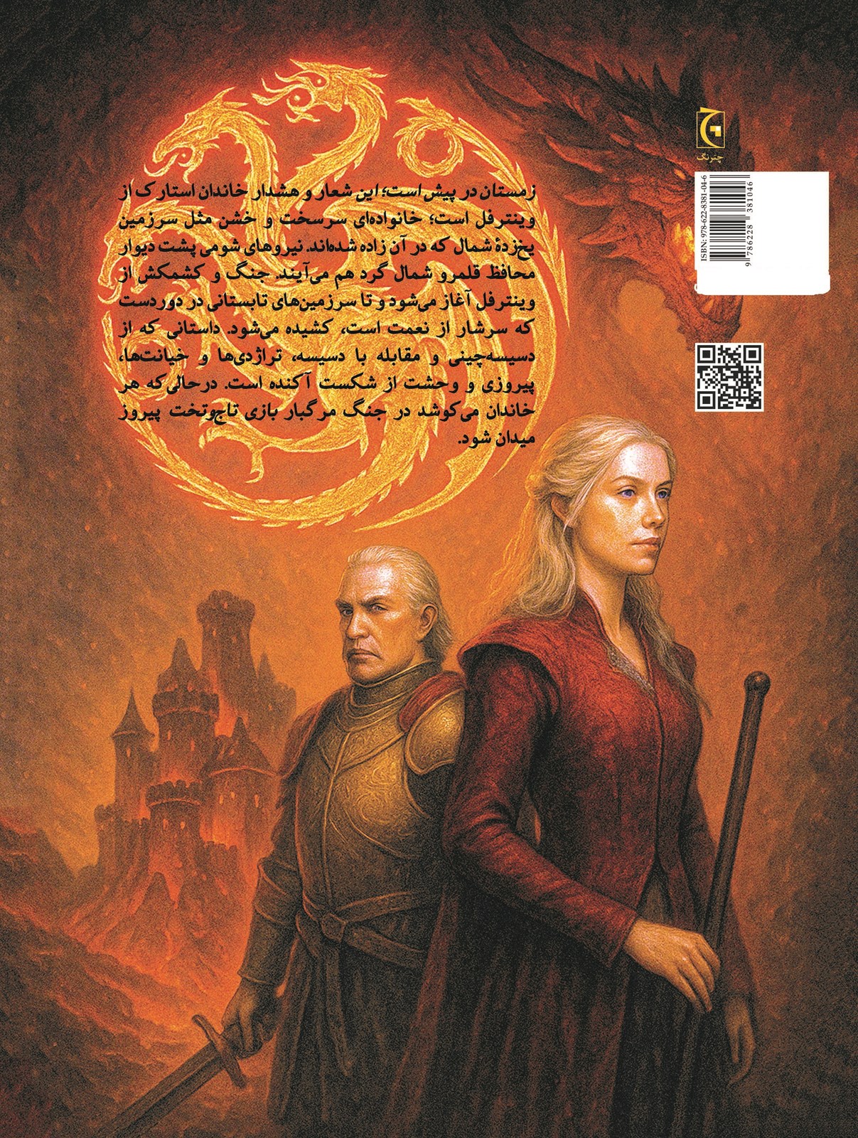 کتاب بازی تاجوتخت اولین جلد از مجموعۀ نغمۀ یخ و آتش است که سریال معروفی با همین نام از آن اقتباس شده است. ماجرای آن ستیز و مبارزه برای تصاحب تاجوتخت است؛ نبردی میان خاندانها تا رسیدن به قدرت. هرکه بیرحمتر و هرکه خودکامهتر باشد، پیروز میدان است. استارکها مردانی سخت از سرزمینهای سرد شمالی، لنیسترها خاندانی ثروتمند با طلای فراوان، تارگرینها از نژاد اژدها و خاندان باراتیون تلفیقی از بلاهت و قدرت... در نبرد و بازی تاجوتختاند. جورج آر. آر مارتین جهان داستانی رمان بازی تاجوتخت را چنان متبحرانه میآفریند که برای هر خوانندهای آن سرزمین خیالی ملموس میشود. نشر چترنگ پیشتر از همین نویسنده کتاب آتش و خون را به چاپ رسانده است که ماجرای آن سیصد سال پیش از بازی تاجوتخت است، رمانی است از دوران پادشاهی خاندان تارگرین. نشر چترنگ در نظر دارد همۀ جلدهای مجموعۀ نغمۀ یخ و آتش را به چاپ برساند.